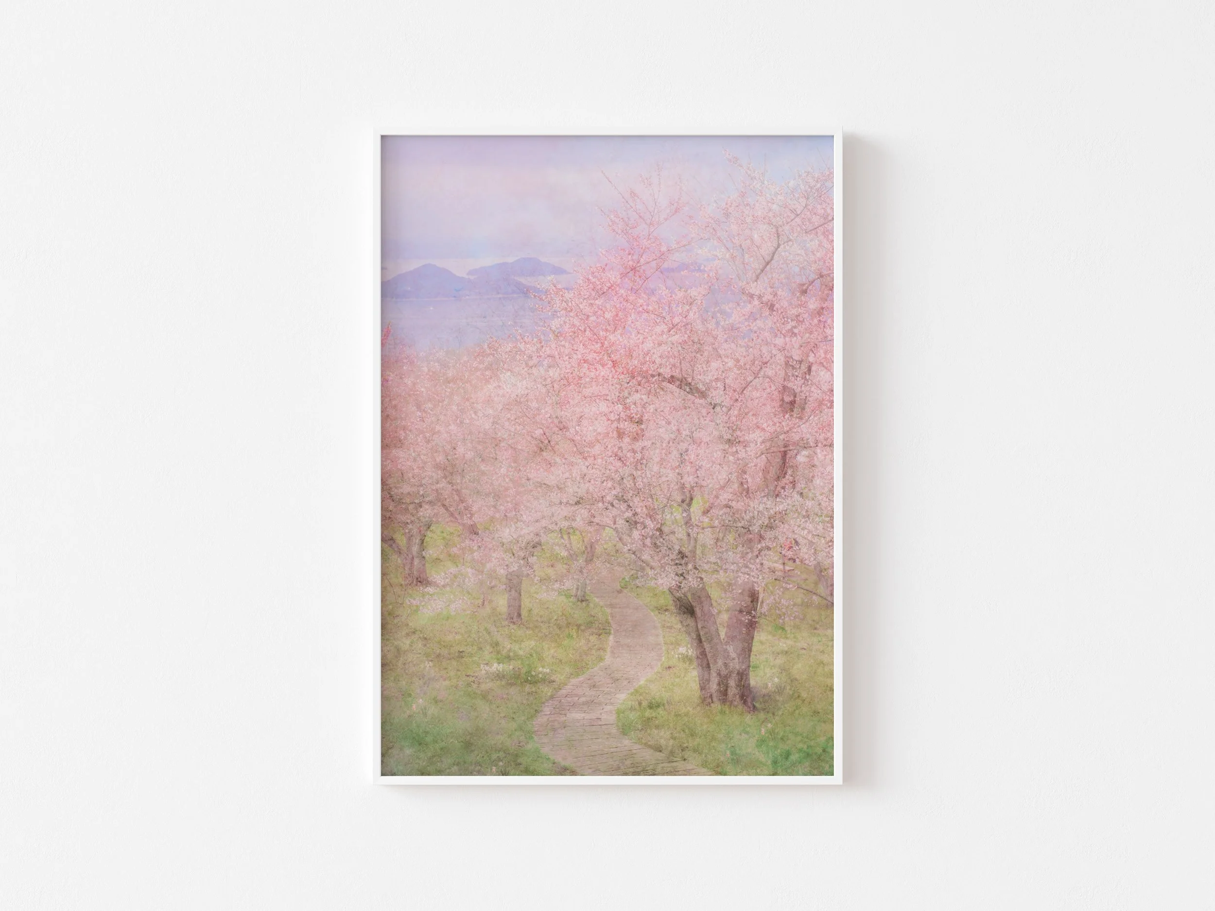 Where cherry blossoms meet the quiet horizon of the sea. Soft petals drift through the gentle spring air, while distant blue waters stretch calmly beyond the blooming trees.