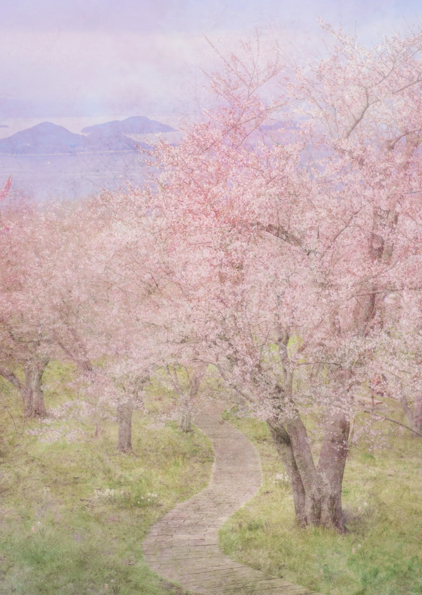 A childhood memory of walking beneath cherry blossoms toward the distant sea, where drifting petals and the quiet ocean seemed to rest together in gentle spring calm
